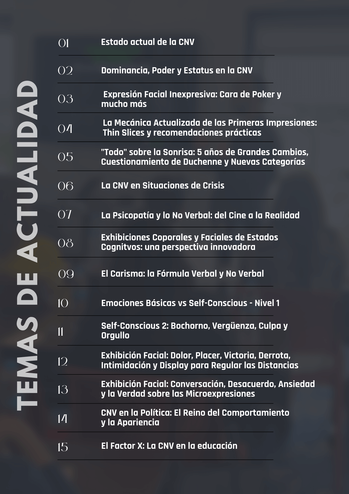 Único curso avanzado en Comunicación No Verbal: Clases con nivel de posgrado y actualizadas científicamente al 2023. Para que conozcas resultados de más de 1000 artículos, capítulos y libros académicos sin tener que leerlos uno por uno